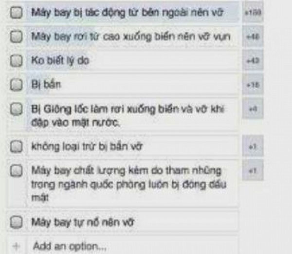 Bảng thăm dò của nhà báo Mai Phan Lợi về vụ máy bay Casa 212 rớt ngày 16 tháng 6, 2016. (Hình: Petro Vietnam chụp lại FB Mai Phan Lợi)