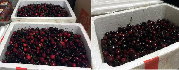 Thùng cherry đầy (ảnh trái) khi ở Mỹ và vơi mất 1/3 (ảnh phải) khi về đến Việt Nam. (Hình: VietNamNet)