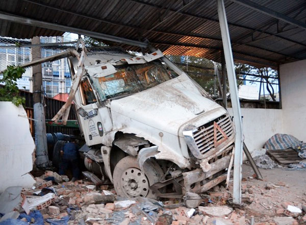 Xe đầu kéo tông sập tường cảng Nhà Rồng, Khánh Hội, quận 4, sáng 20 tháng 6, khiến hàng ngàn xe máy kẹt cứng. (Hình: Zing.vn)