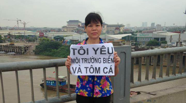 Bà Thêu trong ngày biểu tình vì môi trường vào ngày 22 tháng 5 vừa qua. (Hình: Trịnh Bá Phương cung cấp)