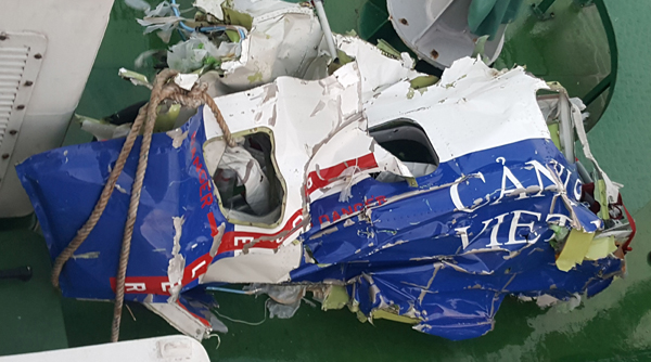 Mảnh vỡ của chiếc máy bay Casa 212 rơi xuống biển khi đi tìm phi công khu trục SU30-MK2 mất tích. (Hình: Hong Pha/Vietnam News Agency via AP)