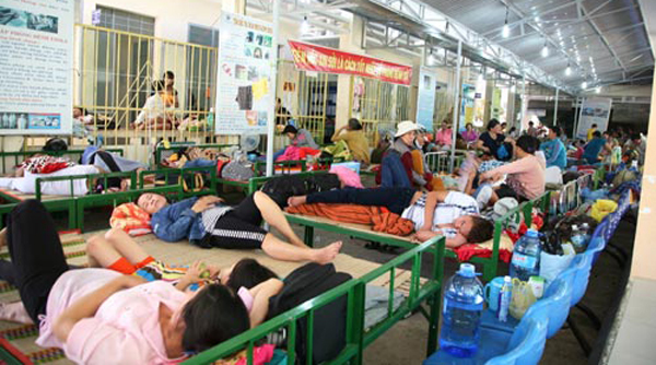 Bệnh viện đa khoa thị xã Ninh Hòa, tỉnh Khánh Hòa. Ngay cả hành lang cũng không còn chỗ, bệnh nhân phải nằm ngoài… sân. (Hình: Báo Dân Việt)