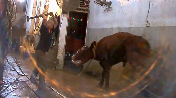 Nhân viên lò sát sinh đập đầu con bò với búa tạ. (Hình: Digital Journal)