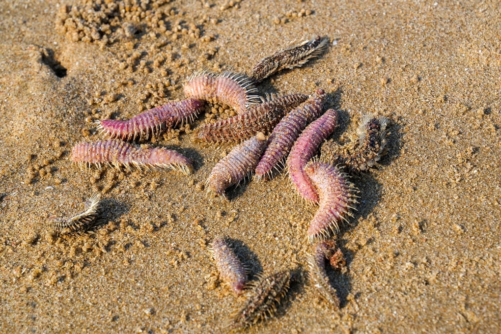 Tại bãi biển từ Hòn Bà đến cuối đường Thùy Vân, sâu biển thân phủ lông, dài cỡ ngón tay người lớn, theo sóng dạt vào bờ.