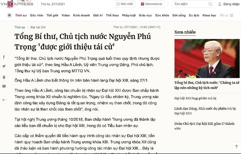 HÀ NỘI, Việt Nam (NV) – Sáng 27 Tháng Giêng, ngày họp thứ ba của Đại Hội 13, các báo nhà nước đã liên tục phải sửa bài, gỡ link sau khi loan tin ông Nguyễn Phú Trọng, tổng bí thư, chủ tịch nước CSVN, được công bố là “trường hợp đặc biệt” để tái cử ghế “tứ trụ.”