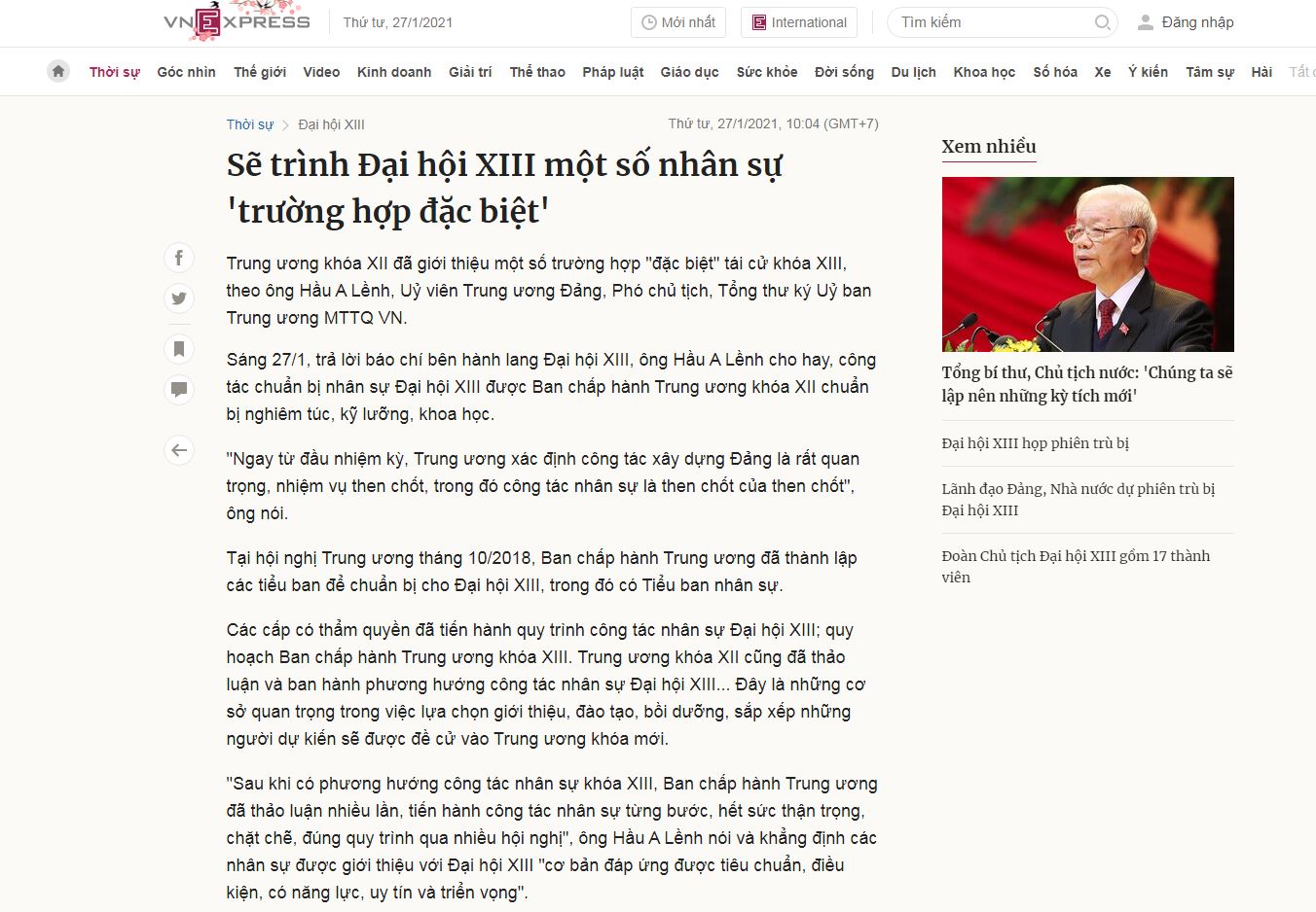 Cùng ngày, tờ Tuổi Trẻ sau khi sửa bài, xóa tên ông Trọng ra khỏi bản tin, dẫn phát ngôn của ông Hầu A Lềnh: “Công tác nhân sự được kế thừa kinh nghiệm của các đại hội trước và căn cứ vào tình hình thực tiễn, những ‘trường hợp đặc biệt’ được Ban Chấp Hành Trung Ương bàn hết sức kỹ lưỡng. Những trường hợp này chủ yếu đặc biệt về độ tuổi, còn đều đủ điều kiện, tiêu chuẩn có sức khỏe, năng lực công tác, có uy tín từ cương vị công tác của mình.”