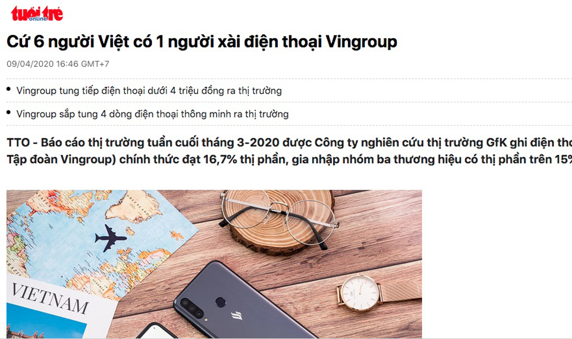 SÀI GÒN, Việt Nam (NV) – “Cứ 6 người Việt có 1 người xài điện thoại Vingroup,” tựa bài trên báo Tuổi Trẻ hôm 9 Tháng Tư nay đã bị tòa soạn sửa tựa sau khi nhận nhiều chỉ trích của cộng đồng mạng vì “PR quá lố.”