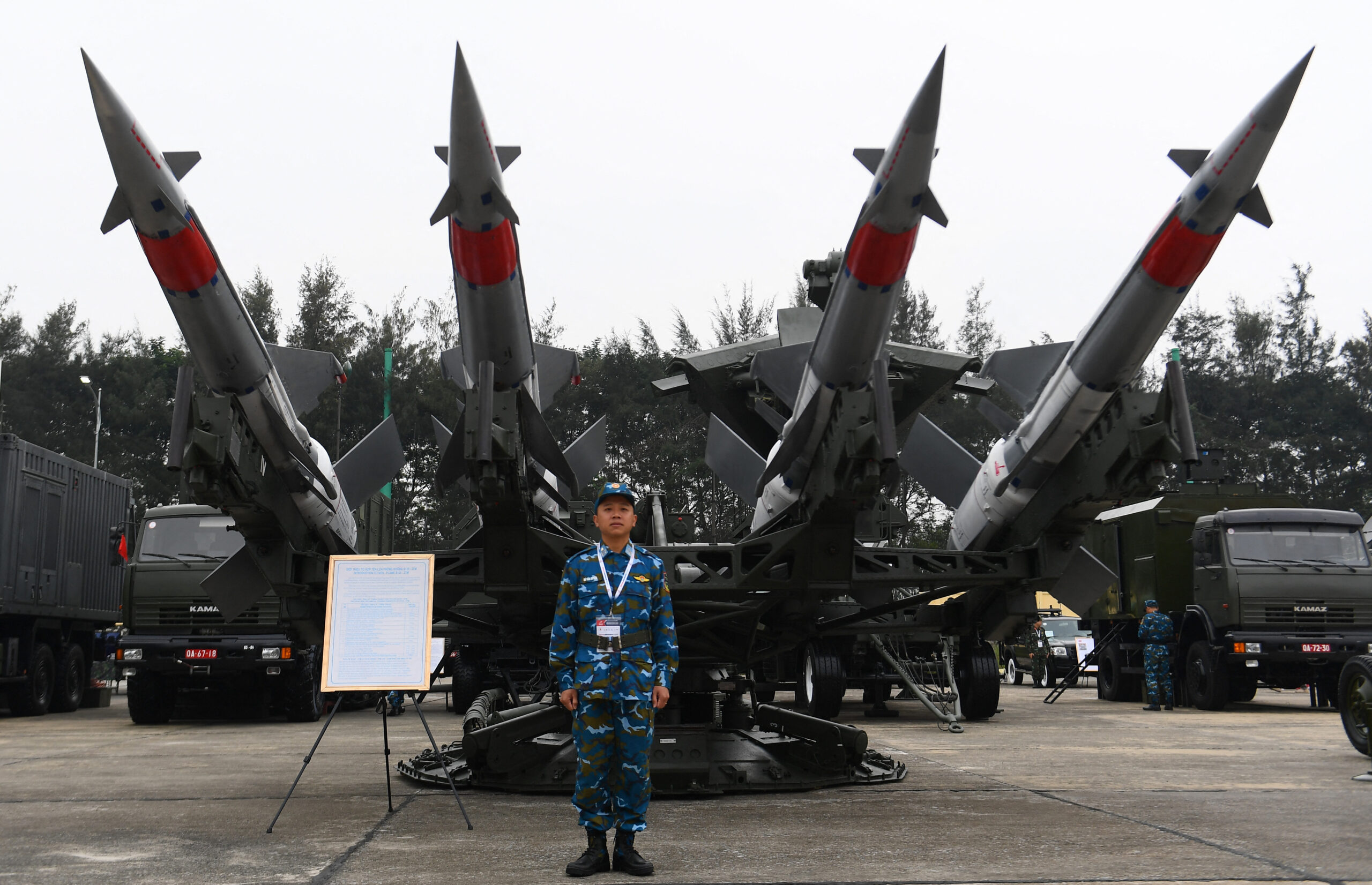 Một giàn hỏa tiễn phòng không CSVN sao chép từ một sản phẩm cổ lỗ của Nga, đưa ra triển lãm khoe với thế giới cuối năm 2024 ở Hà Nội. (Hình: Nhạc Nguyễn/AFP/Getty Images)