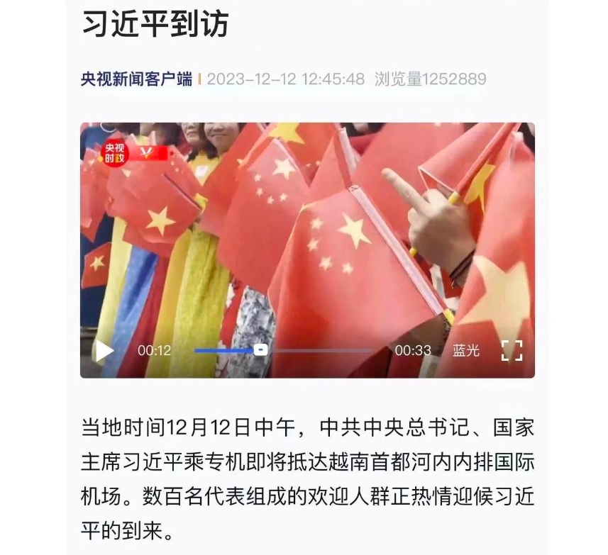 Trang mạng China Digital Times trưng dẫn tấm hình chụp lại từ màn hình của đài truyền hình trung ương Trung Quốc cho thấy giữa những lá cờ phe phẩy đón rước ông Tập Cận Bình và phái đoàn đến thăm Việt Nam ngày 12 Tháng Mười Hai vừa qua, có một cánh tay với “ngón tay giữa” được đưa ra để đón phái đoàn này.
