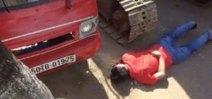 Người dân nằm chặn xe ủi hôm 4 Tháng Giêng. (Hình chụp qua màn hình)