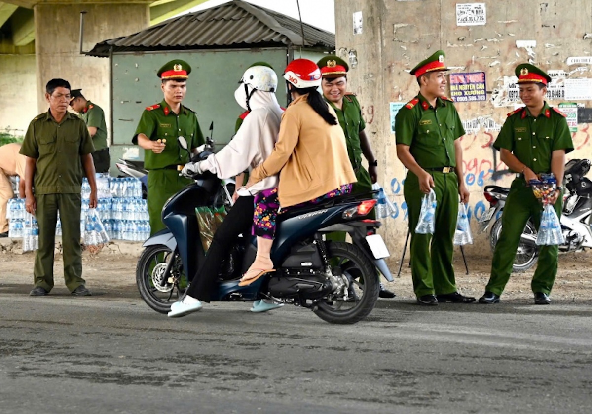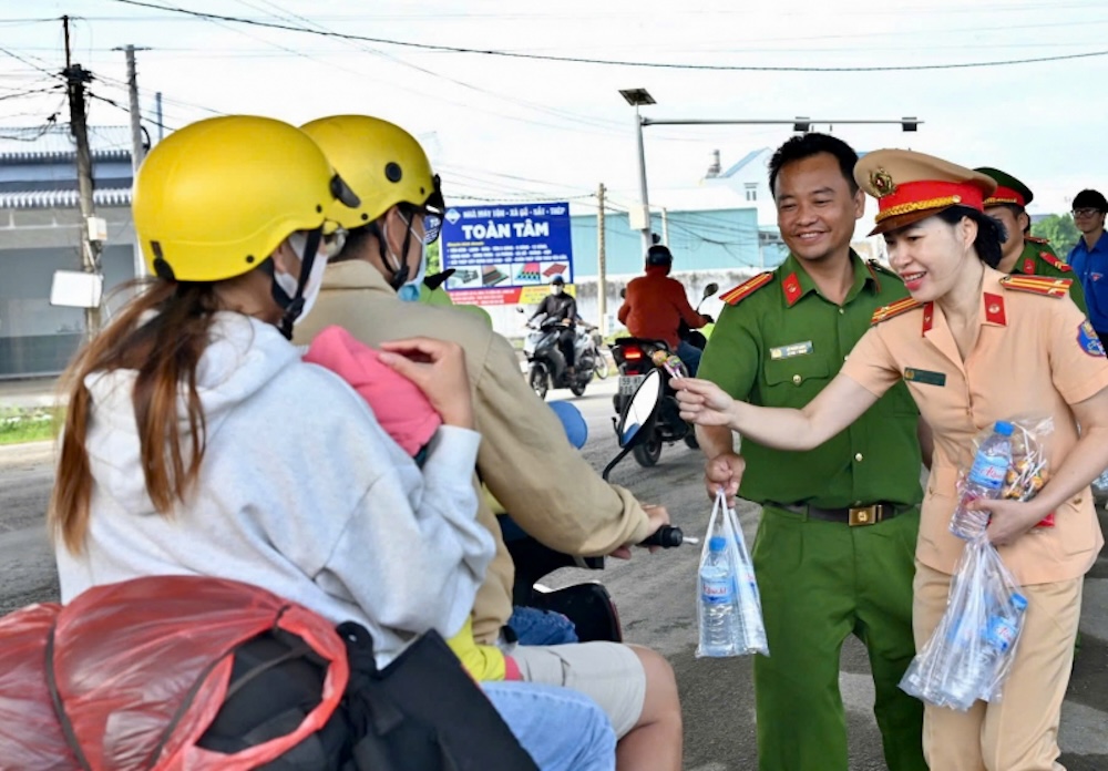 LONG AN, Việt Nam (NV) – “Đến hẹn lại lên,” Công An Tỉnh Long An lại tổ chức dàn dựng màn tặng nước suối cho những người đi xe gắn máy về quê miền Tây ngang qua tỉnh này, trong dịp nghỉ lễ nhân quốc khánh Việt Nam 2 Tháng Chín.