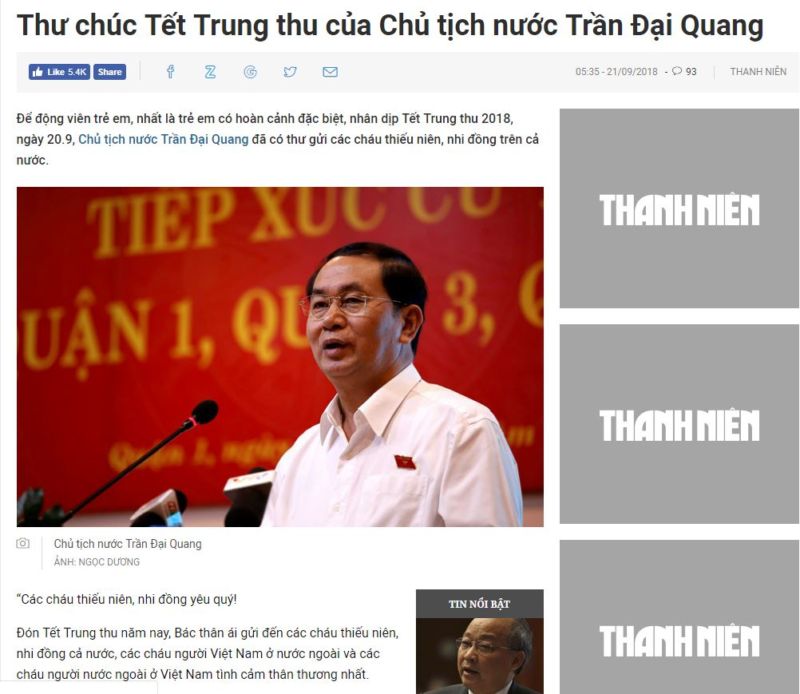 Cùng thời điểm, báo Thanh Niên và nhiều báo trong nước đăng tin “Thư chúc Tết Trung Thu của Chủ Tịch Nước Trần Đại Quang.”