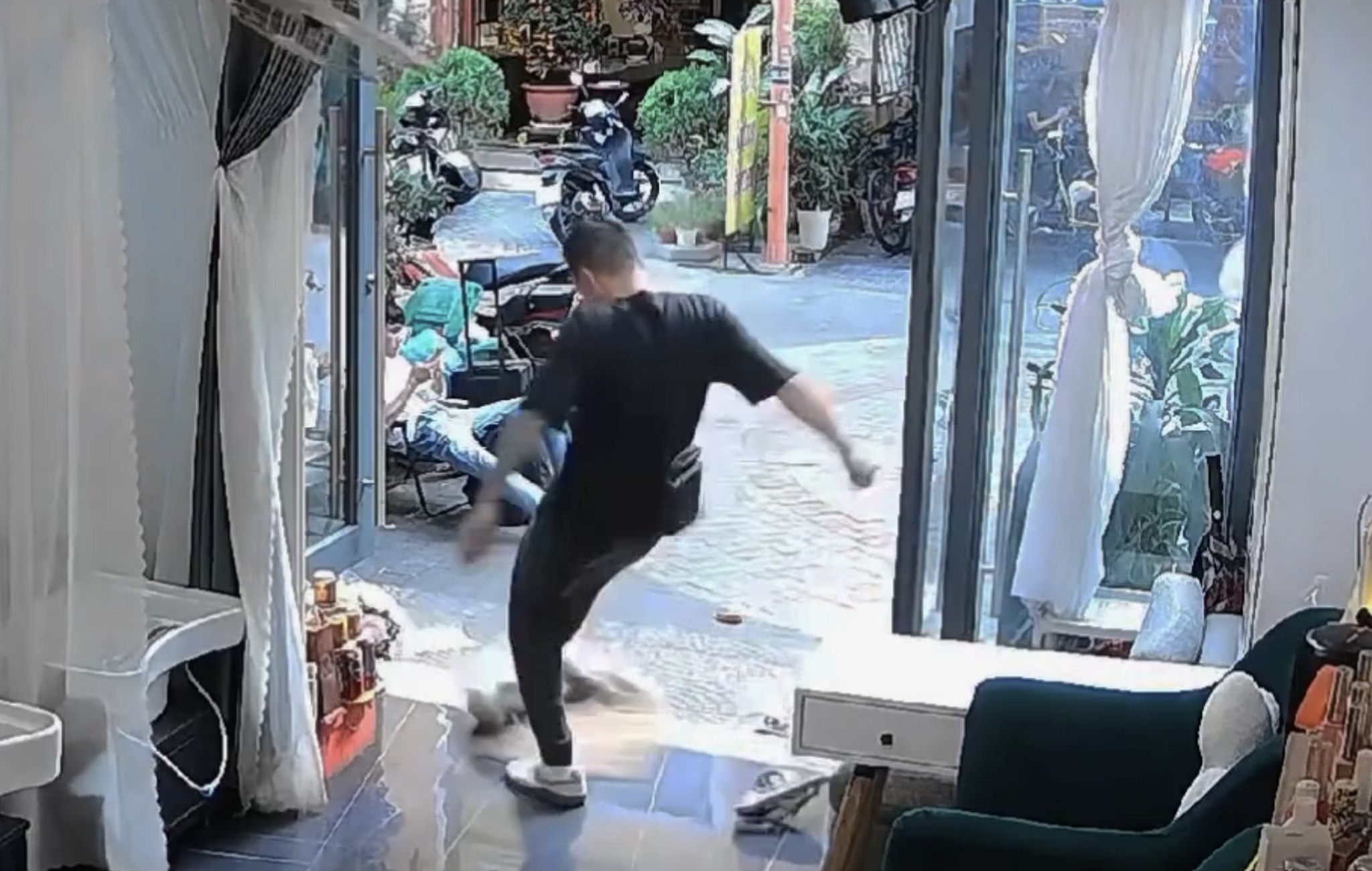 Nam du khách còn lại được nhìn thấy ngồi ngoài cửa, chứng kiến vụ việc nhưng điềm nhiên như chưa có gì xảy ra.