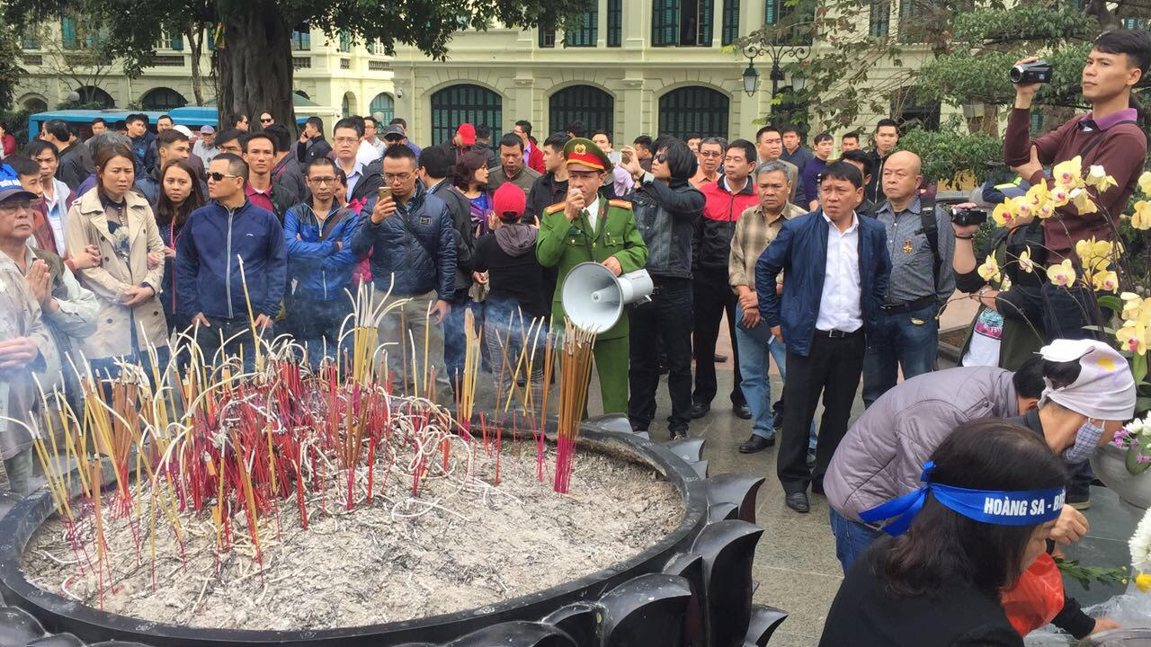 “Khi thấy người dân tới viếng ngày càng nhiều, nhà cầm quyền huy động lực lượng côn đồ và dư luận viên đến đánh phá. Nhiều dư luận viên mặc áo cờ đỏ sao vàng, cầm cờ Cộng Sản nhảy múa, hò hét xung quanh khu vực tượng đài và chửi rủa những người tới tham dự buổi tượng niệm. Sau đó, trưởng công an phường Tràng Tiền cầm loa yêu cầu người dân giải tán, không được tụ tập đông người.”
