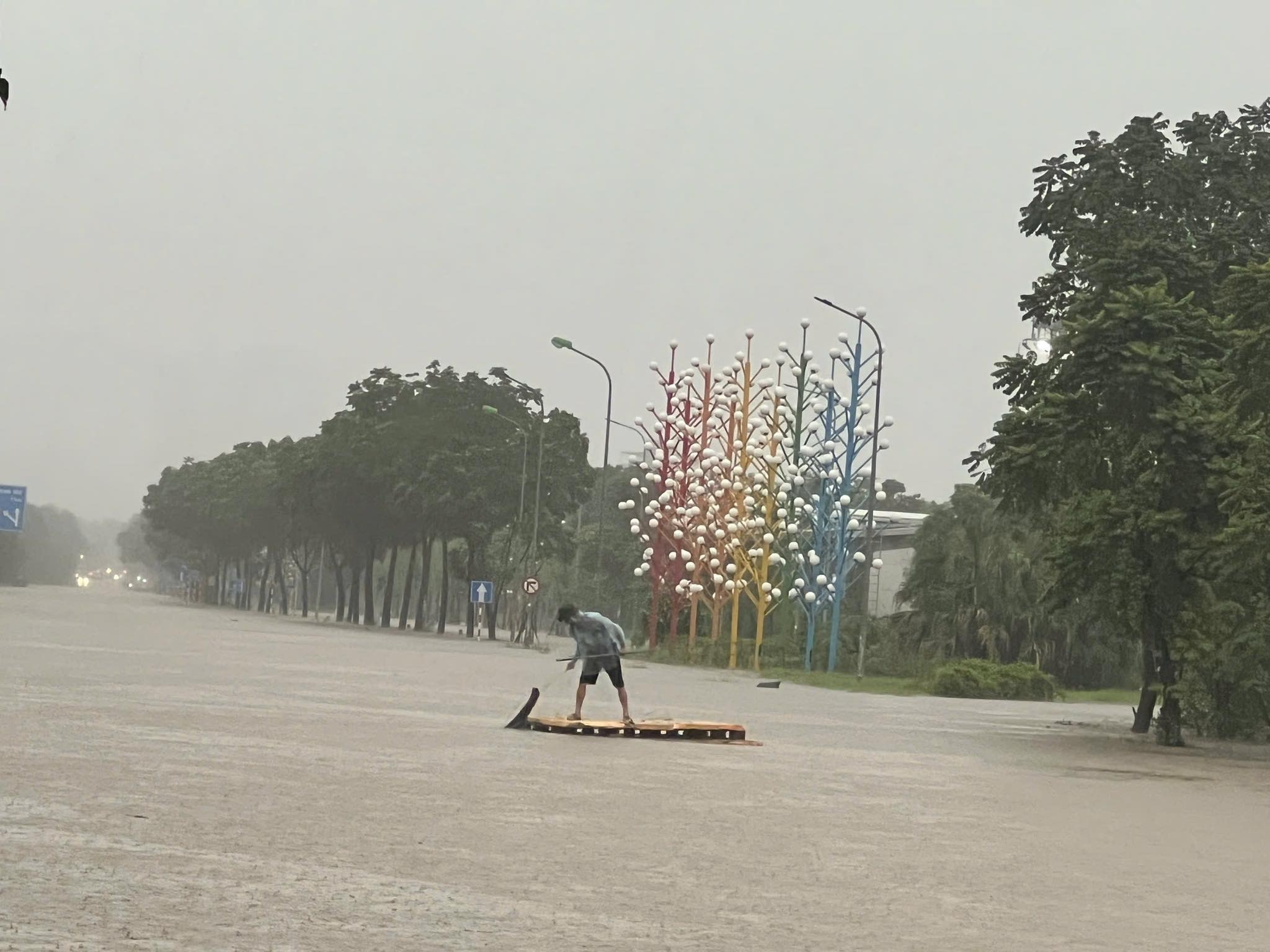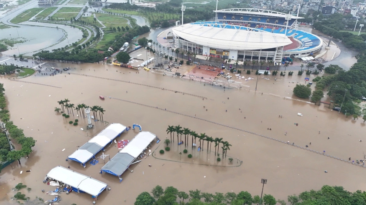 Người dân “bơi” trong dòng nước ngập mênh mông như sông ở quảng trường trước sân vận động Mỹ Đình, Hà Nội. (Hình: Văn Ngọc/VNExpress)