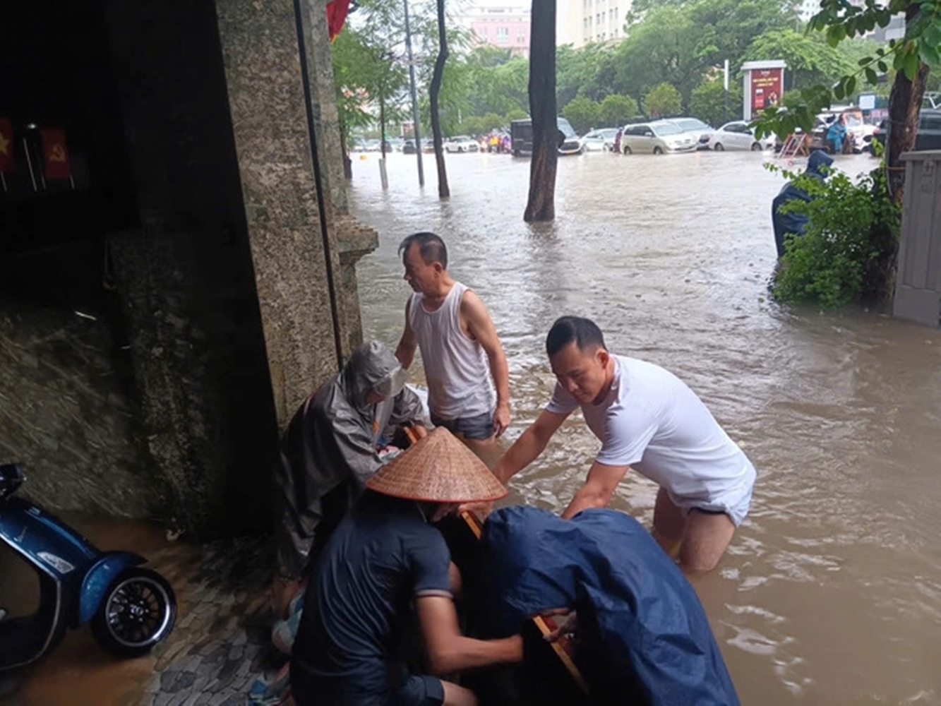 Người dân trên đường Trần Duy Hưng mang các tấm ván, bao cát ra ngăn nước tràn vào hầm để xe. (Hình: Đức Hiến/Tuổi Trẻ)
