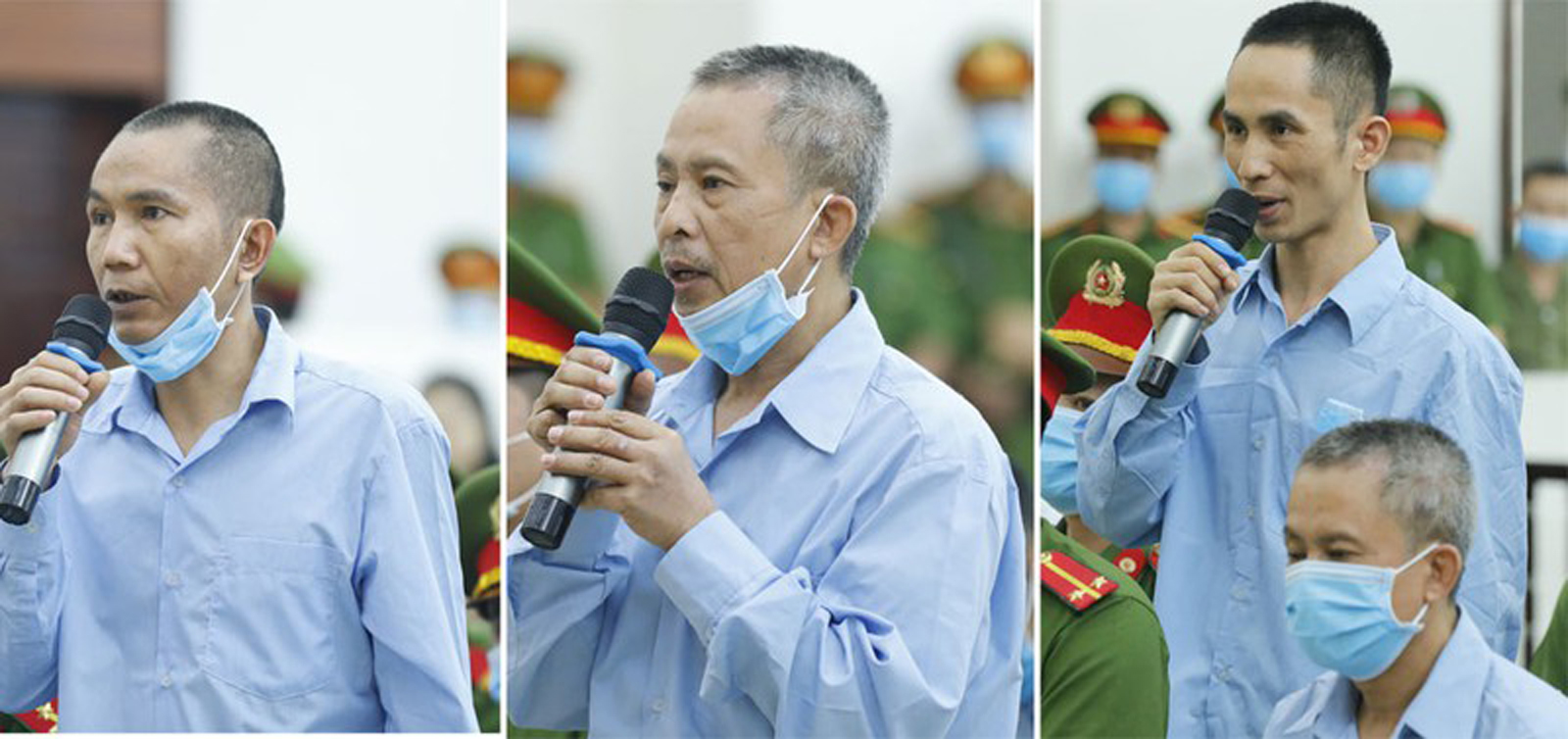 Từ trái, hai người con của ông Lê Đình Kình là Lê Đình Chức và Lê Đình Công bị tuyên tử hình. Người còn lại là Lê Đình Doanh (con trai ông Công và là cháu nội ông Kình) bị tuyên án chung thân. (Hình: Thông Tấn Xã Việt Nam/Thanh Niên)