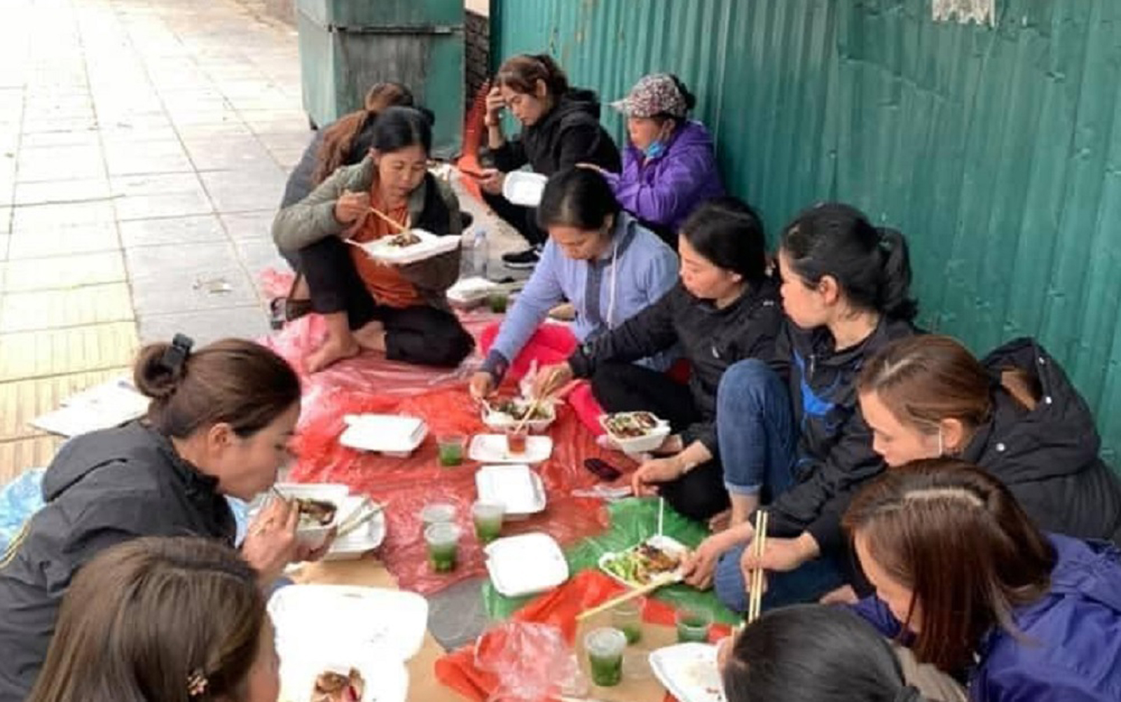 Thân nhân sáu bị cáo kháng án trong vụ án với cáo buộc “Chống đối ở Đồng Tâm” không được dự tòa, nên phải ngồi ngoài lề đường. (Hình: Facebook Duyên Nguyễn)
