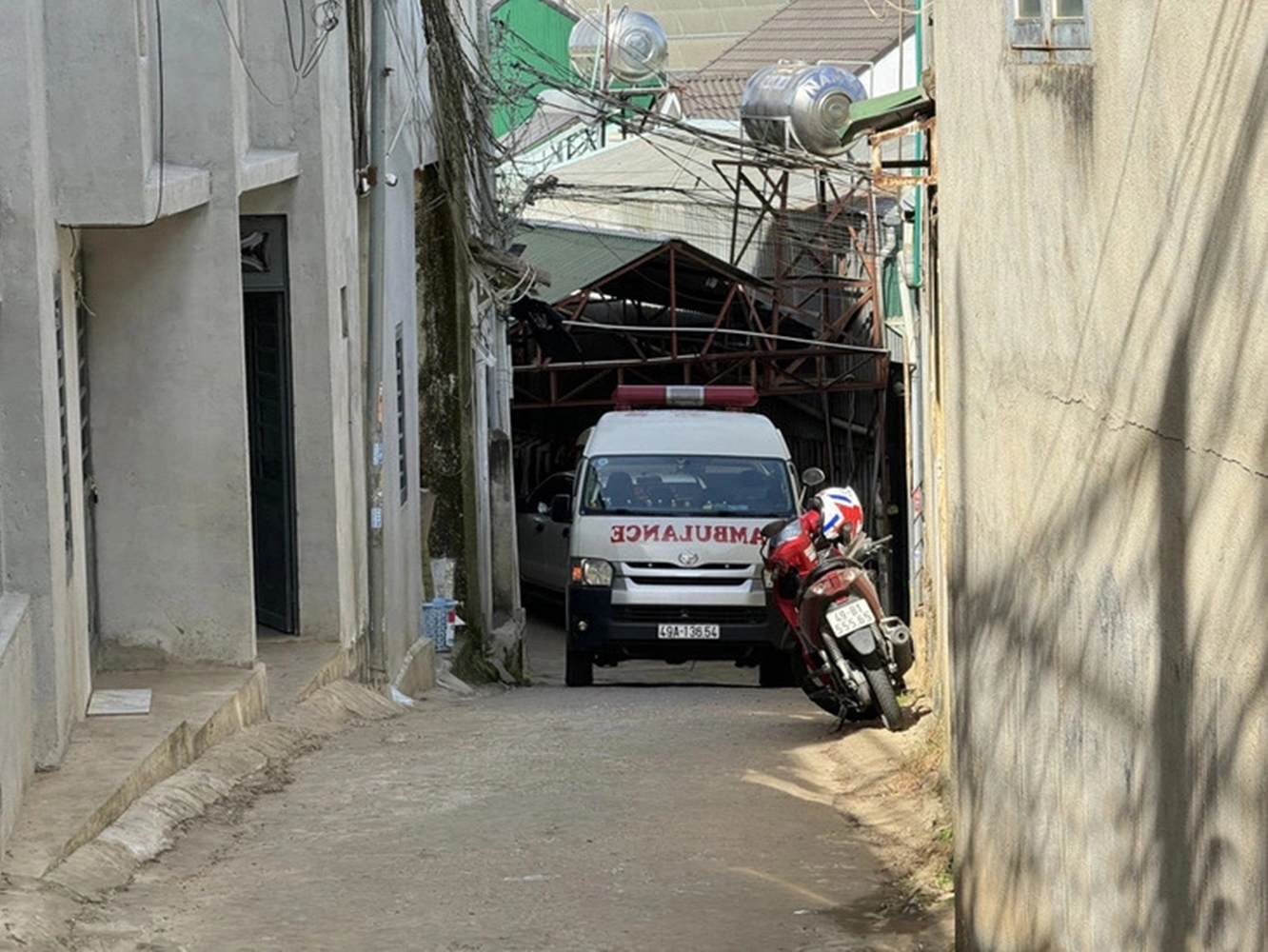 Xe cứu thương chở thi thể nạn nhân rời hiện trường. (Hình: M.V/Tuổi Trẻ)