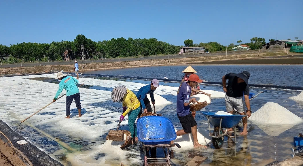 Theo Chi Cục Phát Triển Nông Thôn, toàn tỉnh Vĩnh Long có 1,019 gia đình sản xuất muối với hơn 1,128 hécta đất sản xuất muối. Trong đó, có 136 hécta ruộng muối sản xuất theo mô hình phủ bạt, giải quyết việc làm cho gần 2,999 lao động địa phương.