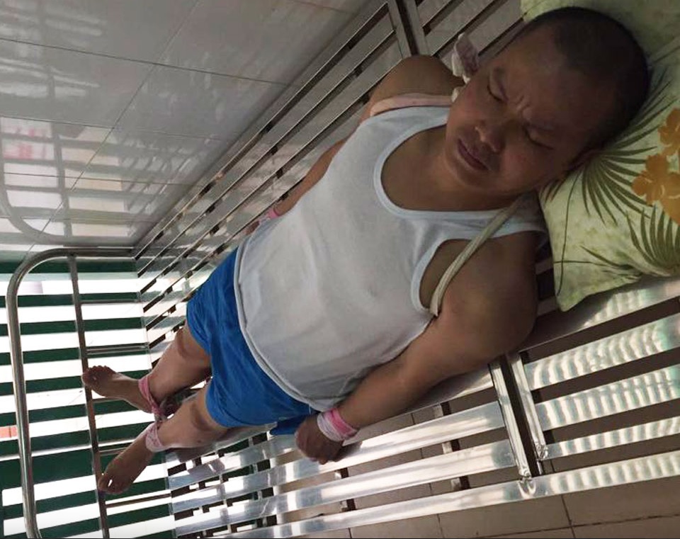 Blogger Lê Anh Hùng bị trói cả người trên giường sắt ngày 16 Tháng Bảy, 2020, vì từ chối uống thuốc tại bệnh viện tâm thần Hà Nội. (Hình: Facebook Nguyễn Vũ Bình)