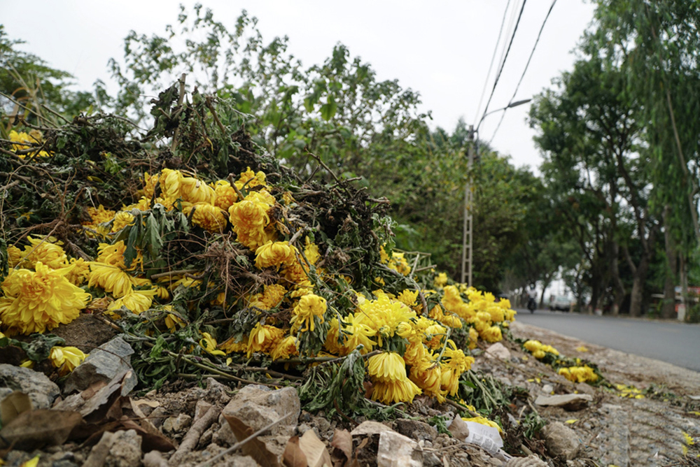 Dọc con đường dẫn vào làng hoa Tây Tựu đầy hoa cúc bị vứt bỏ chất đống bên đường. (Hình: Tuổi Trẻ)