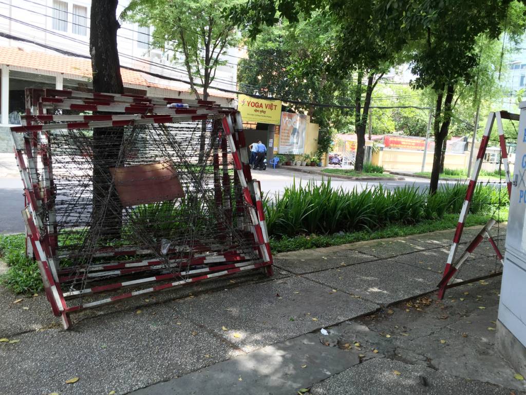 Hàng rào thép gai được giăng đầy trước Lãnh Sự Quán Trung Quốc ở Sài Gòn. (Hình: Việt Hùng/Người Việt)