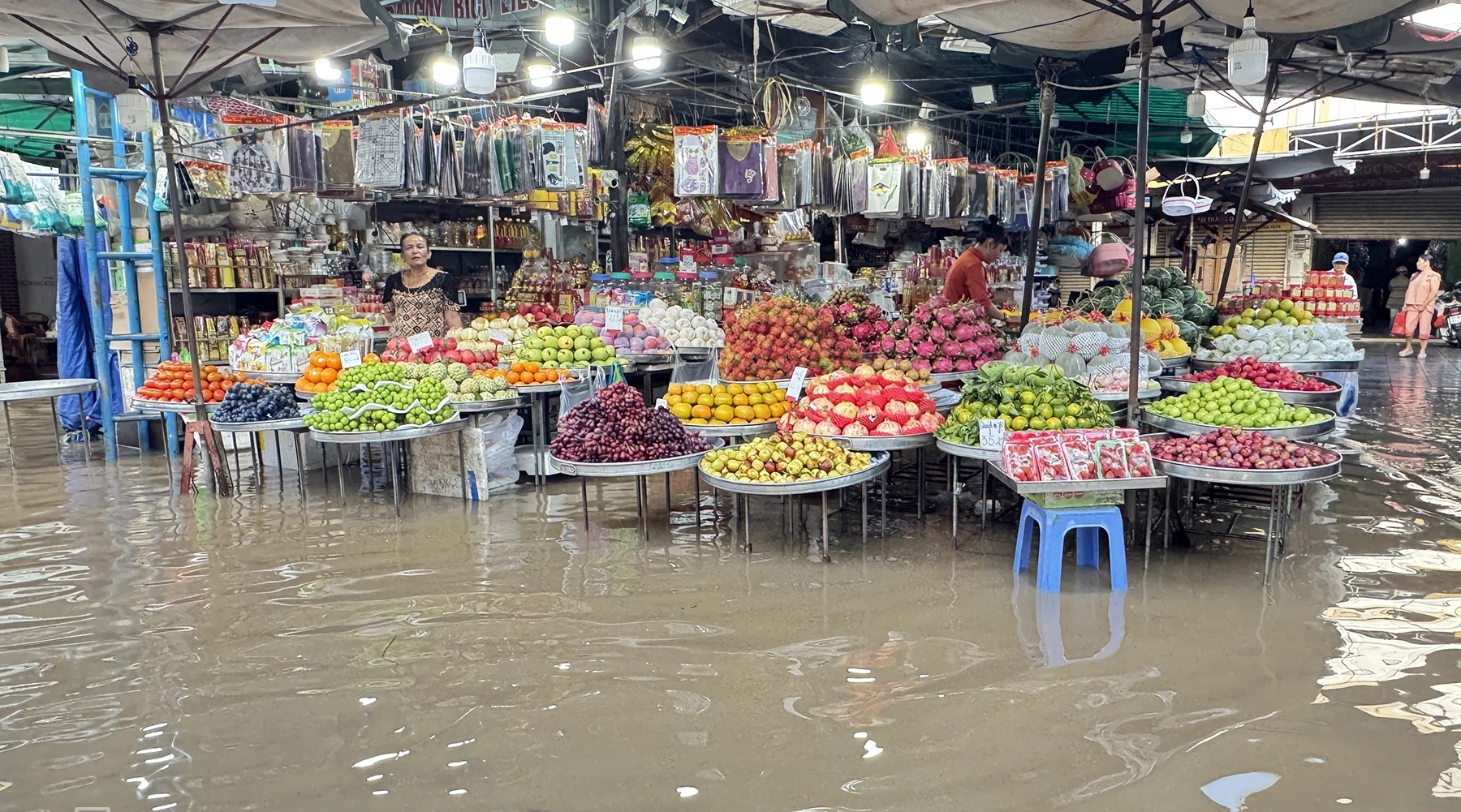 Khu vực bán trái cây tại chợ Bình Thủy, Cần Thơ nước ngập lênh láng, vắng bóng người mua. (Hình: An Bình/VNExpress)