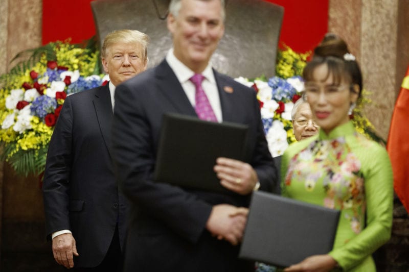 Ông Kevin McAllister, CEO của Boeing Commercial Airplanes, và bà Nguyễn Thị Phương Thảo, CEO của hãng hàng không Vietjet Air, ký hợp đồng với sự chứng kiến của Tổng Thống Donald Trump và Chủ Tịch Nguyễn Phú Trọng tại Phủ Chủ Tịch hôm Thứ Tư, 27 Tháng Hai, 2019, tại Hà Nội. (Hình: AP Photo/ Evan Vucci)