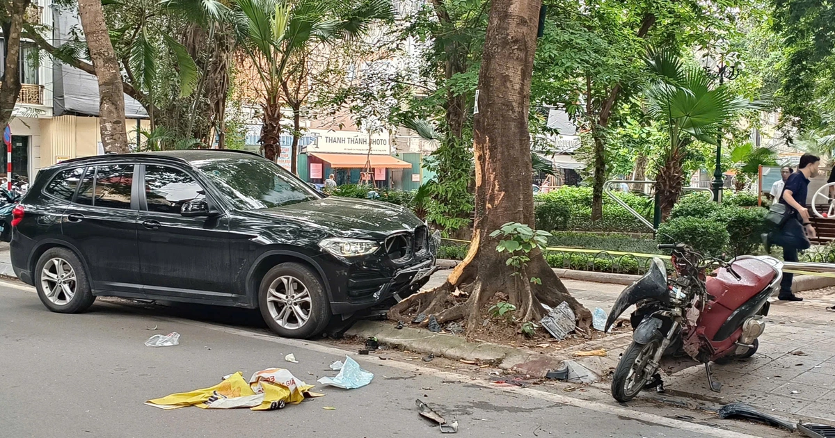 Tại hiện trường, phần đầu chiếc BMW X3 nằm trên vỉa hè và bị hư hỏng nặng. Chiếc xe gắn máy của hai nạn nhân bị biến dạng, nhiều mảnh vỡ văng khắp nơi.