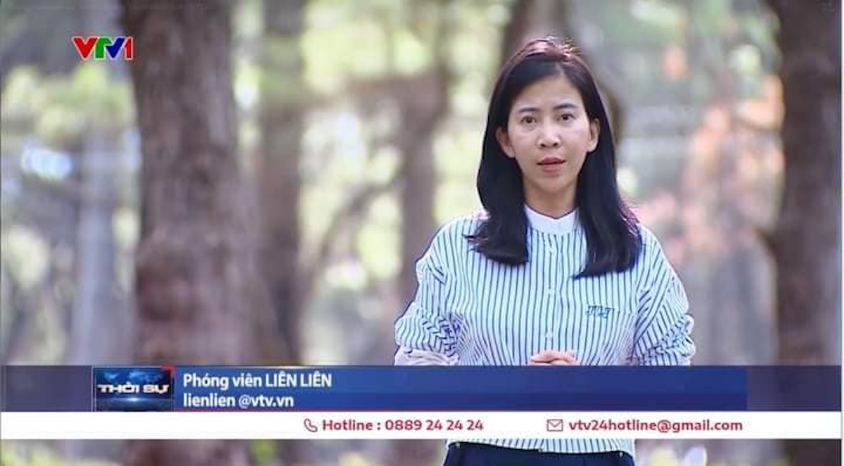 Phóng viên Liên Liên trong đoạn video clip trên kênh VTV1. (Hình: Chụp qua màn hình)
