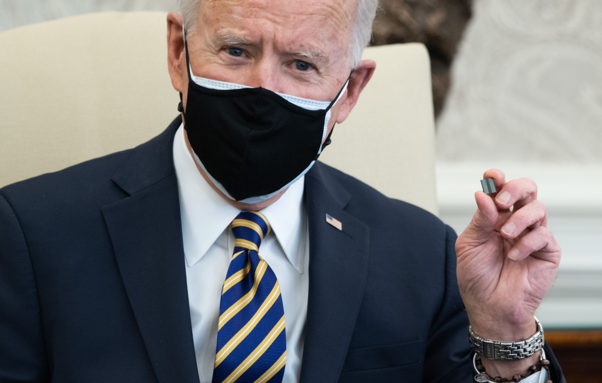 Tổng Thống Joe Biden cầm một con chip điện tử trong cuộc họp hôm Thứ Tư, 24 Tháng Hai, với các nhà lập pháp lưỡng viện về tình trạng khan hiếm hiện nay. (Hình: Saul Loeb/AFP via Getty Images)